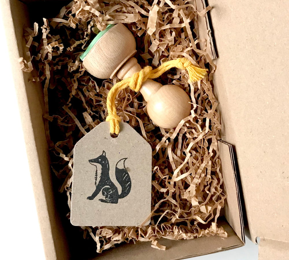 Stempelek zapakowany jest w tekturowe ekologiczne pudełko wypełnione naturalną wełną drzewną lub ekologicznym ozdobnym wypełniaczem papierowym.